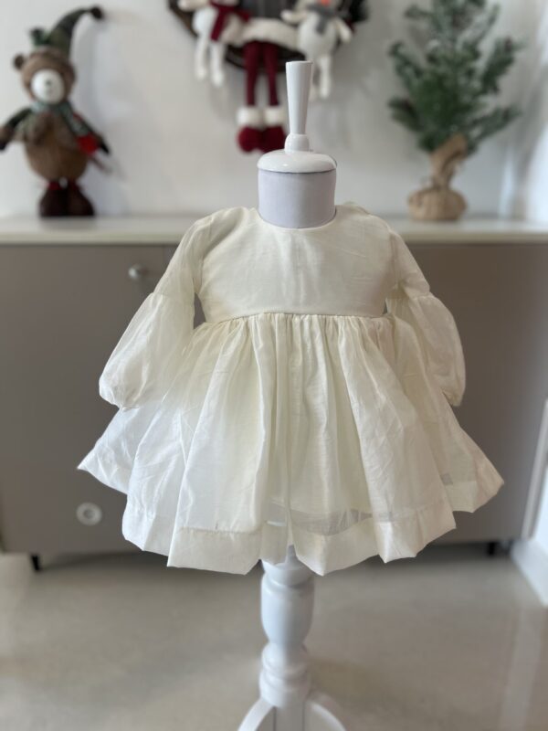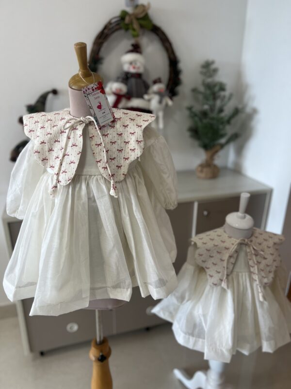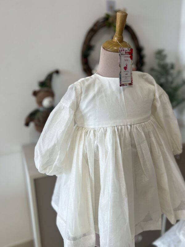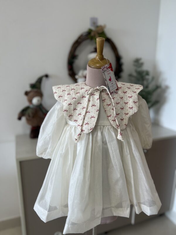 Classy nd chic white chanderi dress with detachable ribbon collar .